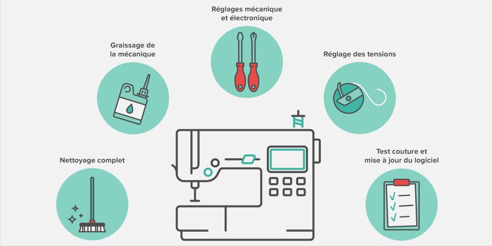 Nous réparons et entretenons tous types de machines à coudre, qu'il s'agisse d'une machine à coudre, d'une surjeteuse, d'une brodeuse, d'une recouvreuse ou de matériel de repassage.