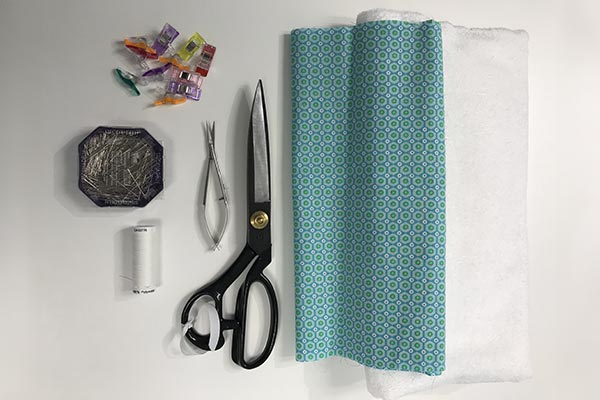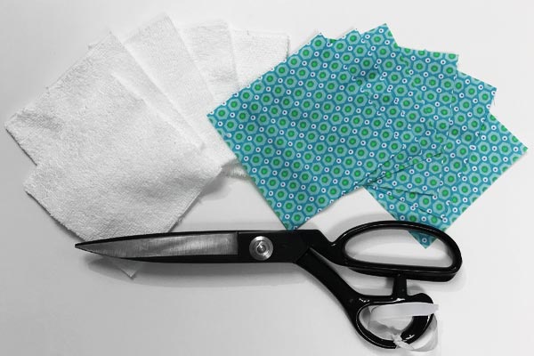 - Superposez un carré de tissu éponge sur un morceau de coton envers contre envers.