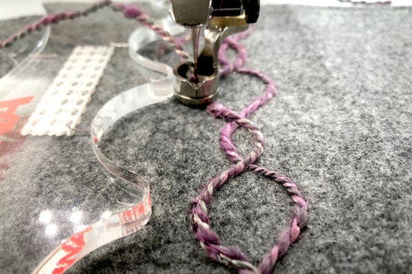 C'est également une technique de piqué libre, et la machine est utilisée avec les griffes d'entraînement abaissées. Cependant, avec cette technique, il y a l'ajout d'une règle en acrylique pour aider à obtenir une forme spécifique.