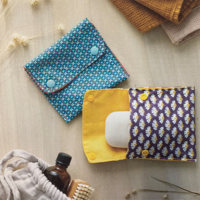 Un must-have pour ceux qui utilisent des cosmétiques solides en voyage. En tissu enduit ou PUL, il protège le reste de la trousse de toilette de l’humidité. Photo tirée du livre : « Couture zéro déchet dans ma salle de bain » par Anaïs Malfilatre