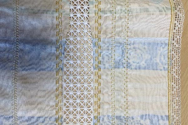 Vous pouvez poser un ruban de dentelle classiquement sur un bord ou en entredeux mais vous pouvez également utiliser les points décoratifs de votre machine à coudre.